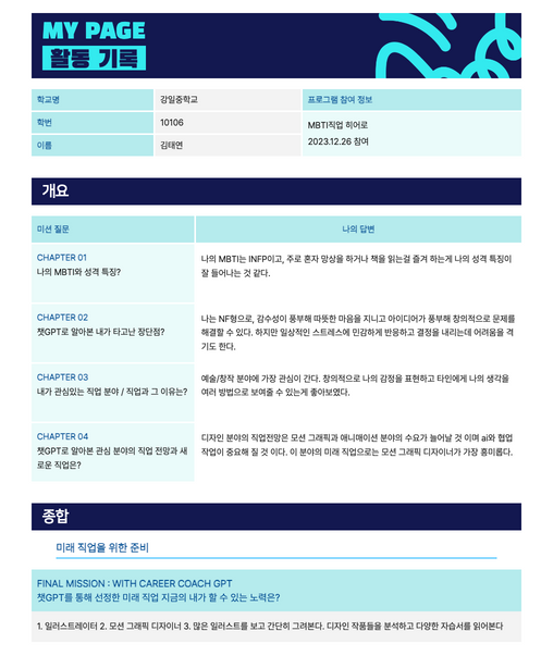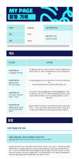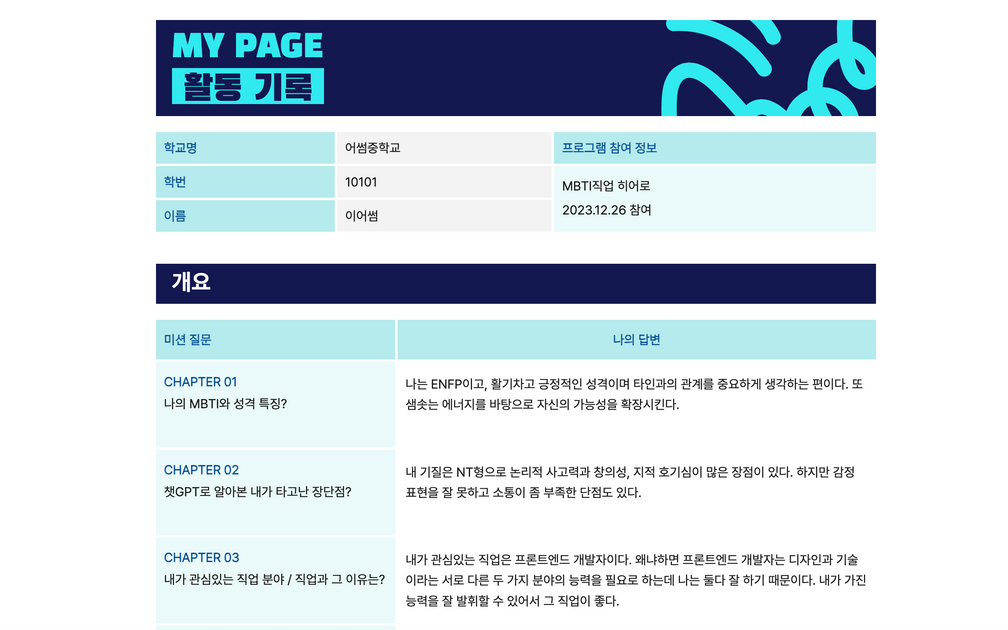 학생 개인별 활동 리포트 (MBTI직업 히어로 예시)